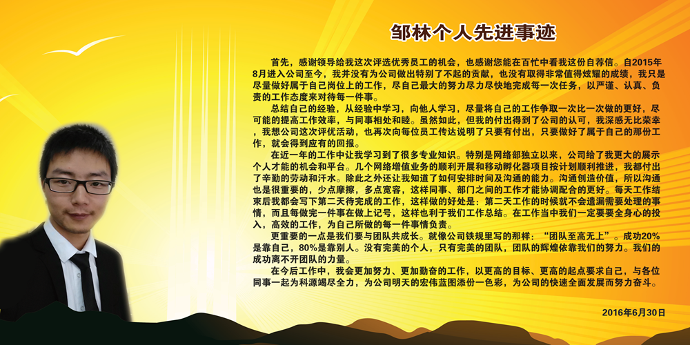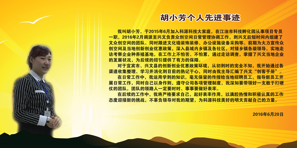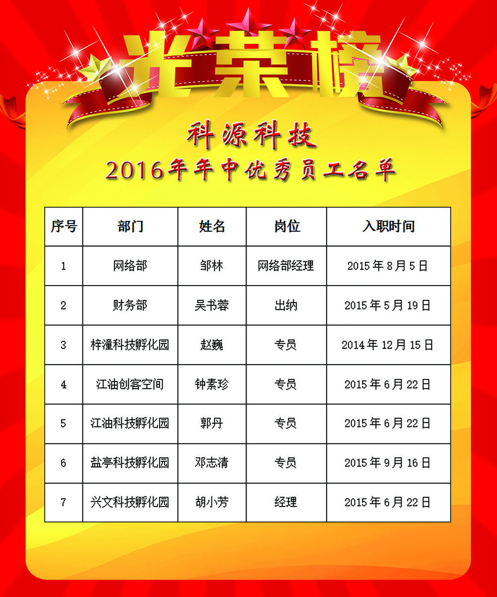 為了進(jìn)一步激勵(lì)員的工作積極性,提高工作熱情,建立公司高效團(tuán)隊(duì)、發(fā)掘優(yōu)秀人才,推動(dòng)公司總體戰(zhàn)略目標(biāo)的實(shí)現(xiàn)。公司本著激勵(lì),促進(jìn)、提高的原則,同時(shí)有效推進(jìn)績效考核工作,決定在全體員工中開展2016年年中優(yōu)秀員工評(píng)選工作,現(xiàn)將評(píng)選結(jié)果公布如下: 上一篇:科源全體員工合照 ????下一篇:科源科技2016年四季度優(yōu)秀員工光榮榜