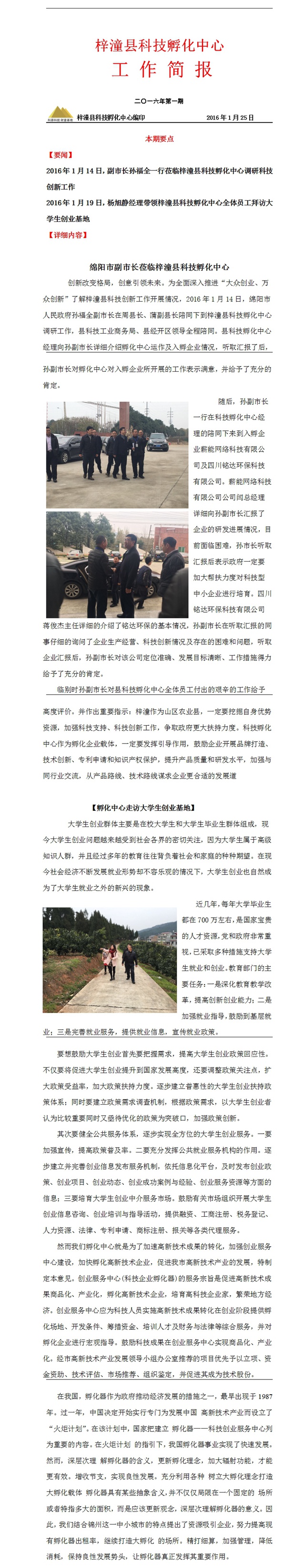 梓潼縣科技孵化中心二零一六年一月工作簡報